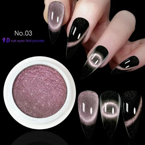 Este increíble polvo combina efecto espejo con el mágico efecto ojo de gato, creando un acabado profundo, brillante y multidimensional que cambia según la luz. Puedes usarlo como efecto cromado tradicional o potenciarlo con un imán para lograr ese look misterioso de “cat eye” 😻.